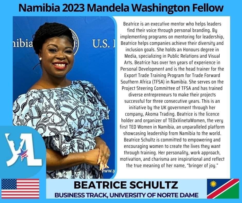 #Namibia, meet Beatrice Schultz, one of our 2023 @Mandela Washington Fellowship for Young African Leaders Initiative (#YALI2023) Program. She will be studying Leadership in Business at the University of Notre Dame.